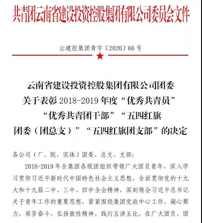第十六直管部團(tuán)支部、第十九直管部團(tuán)支部獲評2018-2019 年度云南建投集團(tuán)“五四紅旗團(tuán)支部”。