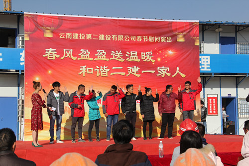 “春風(fēng)盈盈送溫暖、和諧二建一家人?!?1月14日至15日,公司團(tuán)委組織公司文藝團(tuán)隊(duì)到昭通市昭陽(yáng)區(qū)2013年保障房項(xiàng)目開(kāi)展春節(jié)慰問(wèn)演出,為項(xiàng)目一線的職工和工友們送去新春佳節(jié)的祝福。