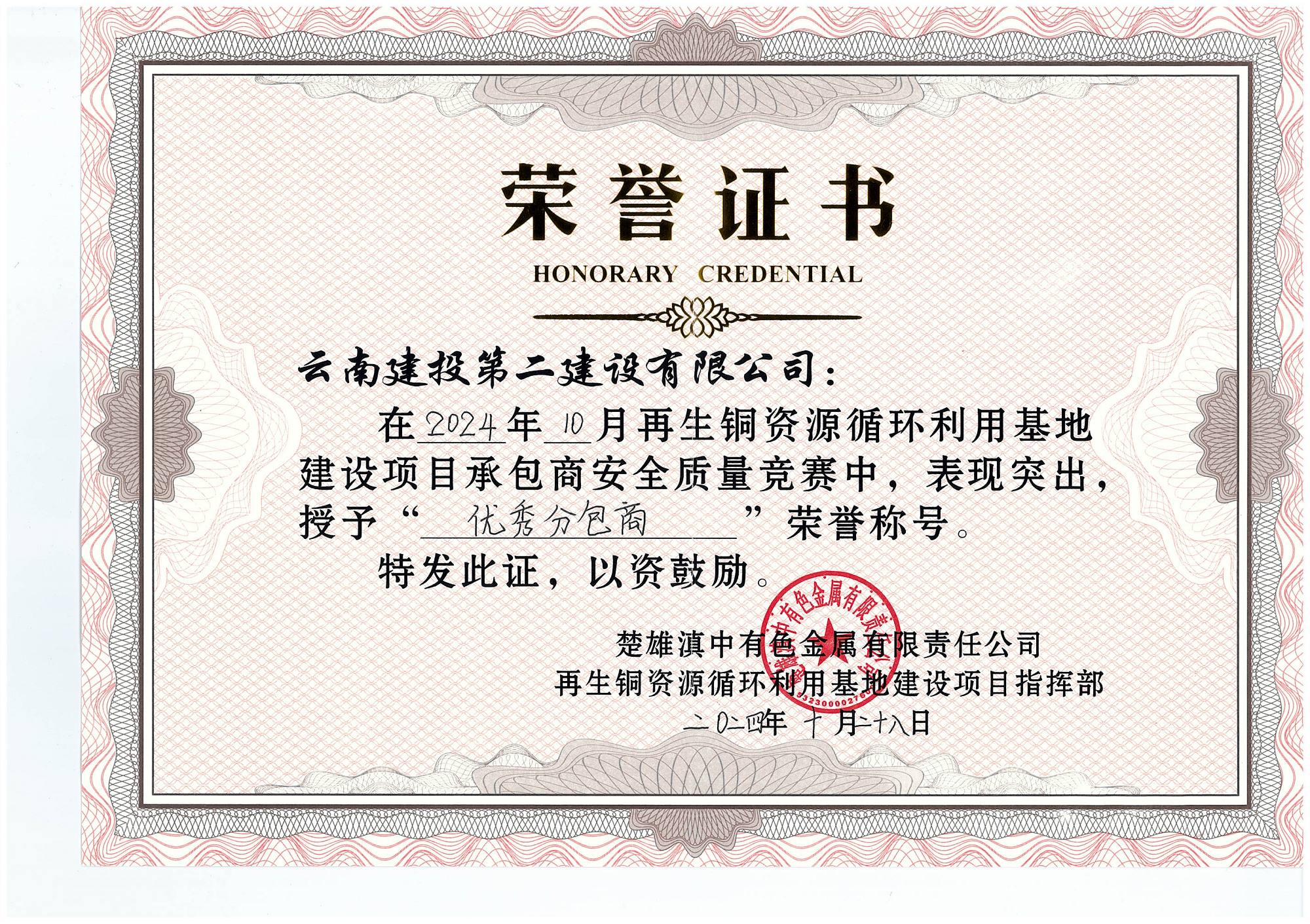 楚雄滇中有色金屬有限責任公司再生銅資源循環(huán)利用基地建設項目自2024年6月17日開工以來,嚴格執(zhí)行公司各項管理制度要求,與業(yè)主單位建立了良好的溝通機制,在嚴守安全底線和紅線的同時高標準控制工程實體質量。本次榮譽的獲得對于項目部來說既是鼓勵也是鞭策,項目部將再加再勵,優(yōu)質高效推進項目建設,嚴格按照節(jié)點要求實現(xiàn)項目投產目標。