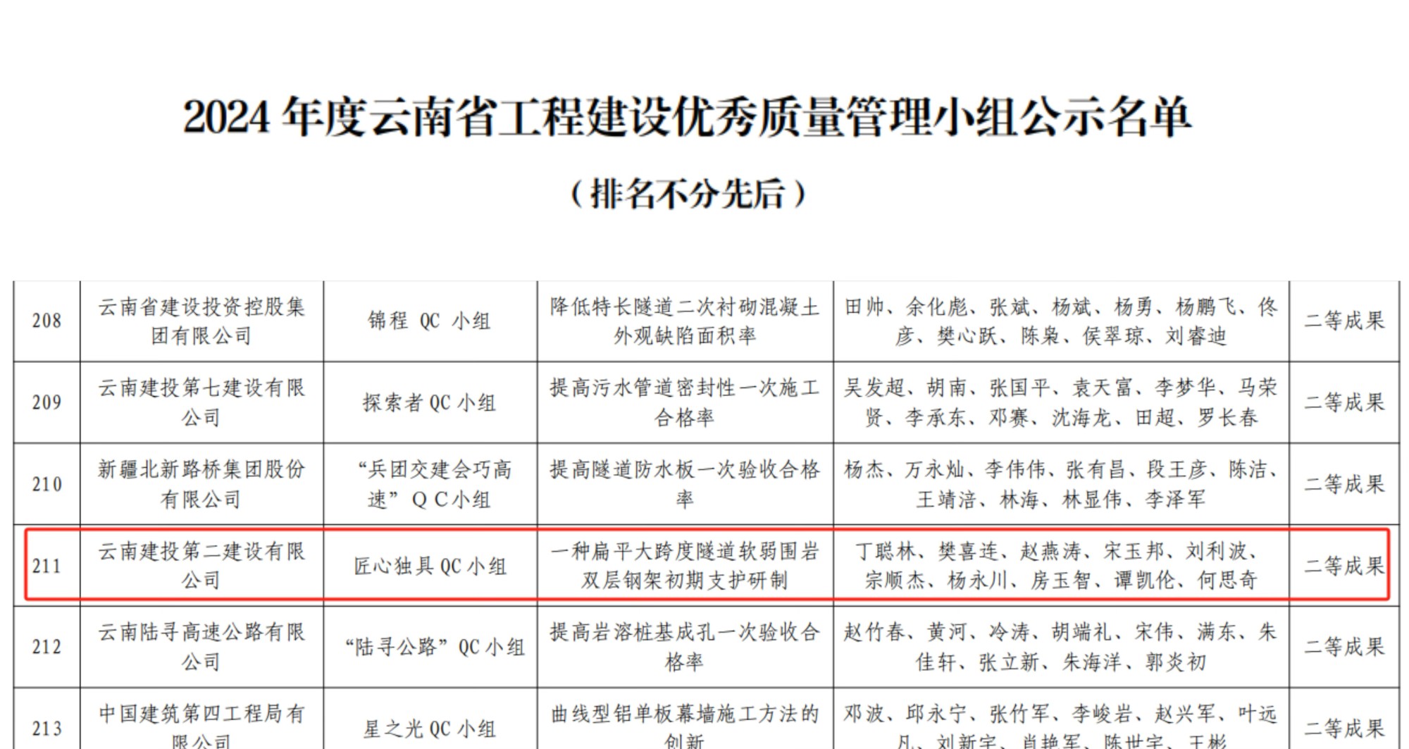 近日,第十九直管部匠心獨具QC小組開展的課題“一種扁平大跨度隧道軟弱圍巖雙層鋼架初期支護(hù)研制”榮獲省級QC二等成果。第十九直管部通過施工工藝總結(jié)行成的“橋梁滿堂支撐腳手架高支模安全監(jiān)測工法”榮獲集團(tuán)級工法。