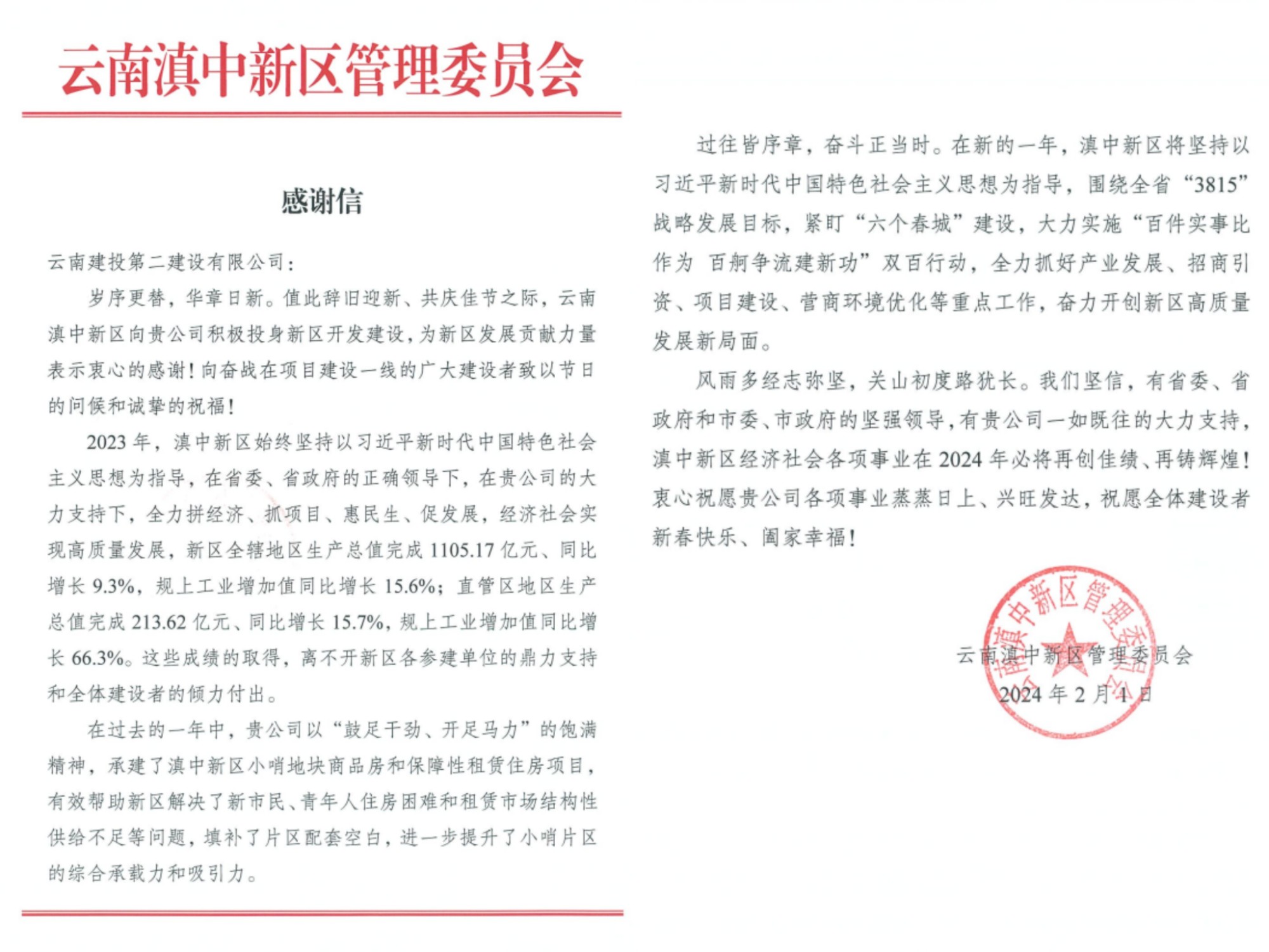 近日,公司收到一封來(lái)自云南滇中新區(qū)管理委員會(huì)的感謝信。信中感謝了公司積極投入新區(qū)開(kāi)發(fā)建設(shè),為新區(qū)發(fā)展貢獻(xiàn)了力量,并向奮戰(zhàn)在項(xiàng)目建設(shè)一線(xiàn)的建設(shè)者致以節(jié)日的問(wèn)候和誠(chéng)摯的祝福。