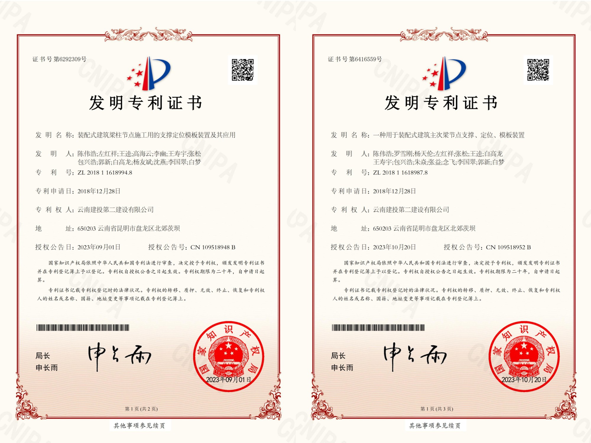 2023年,公司申報(bào)的《一種疊合板鋼筋擺放架》、《一種用于裝配式建筑主次梁節(jié)點(diǎn)支撐、定位、模板裝置》、《裝配式建筑梁柱節(jié)點(diǎn)施工用的支撐定位模板裝置及其應(yīng)用》、《一種電梯施工平臺及其控制方法》、《一種便攜式建筑施工用激光投線儀》、《一種用于裝配式建筑的多功能支撐頂托裝置》等6項(xiàng)發(fā)明專利獲得國家知識產(chǎn)權(quán)局授權(quán)。