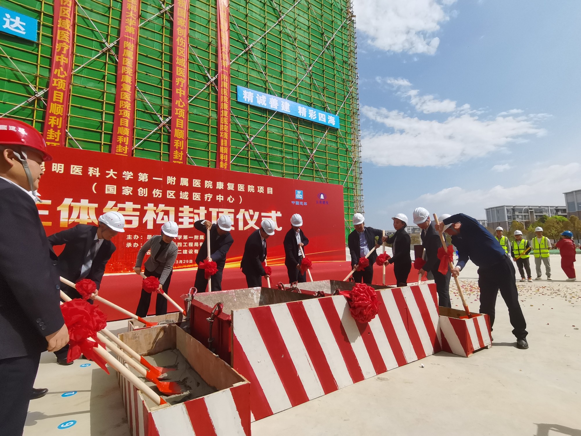3月29日上午,昆明醫(yī)科大學(xué)第一附屬醫(yī)院在呈貢康復(fù)醫(yī)院項(xiàng)目部舉行主體結(jié)構(gòu)封頂儀式。公司黨委副書(shū)記、董事長(zhǎng)陳定華,黨委委員、工會(huì)主席胡云紅受邀參加封頂儀式。
