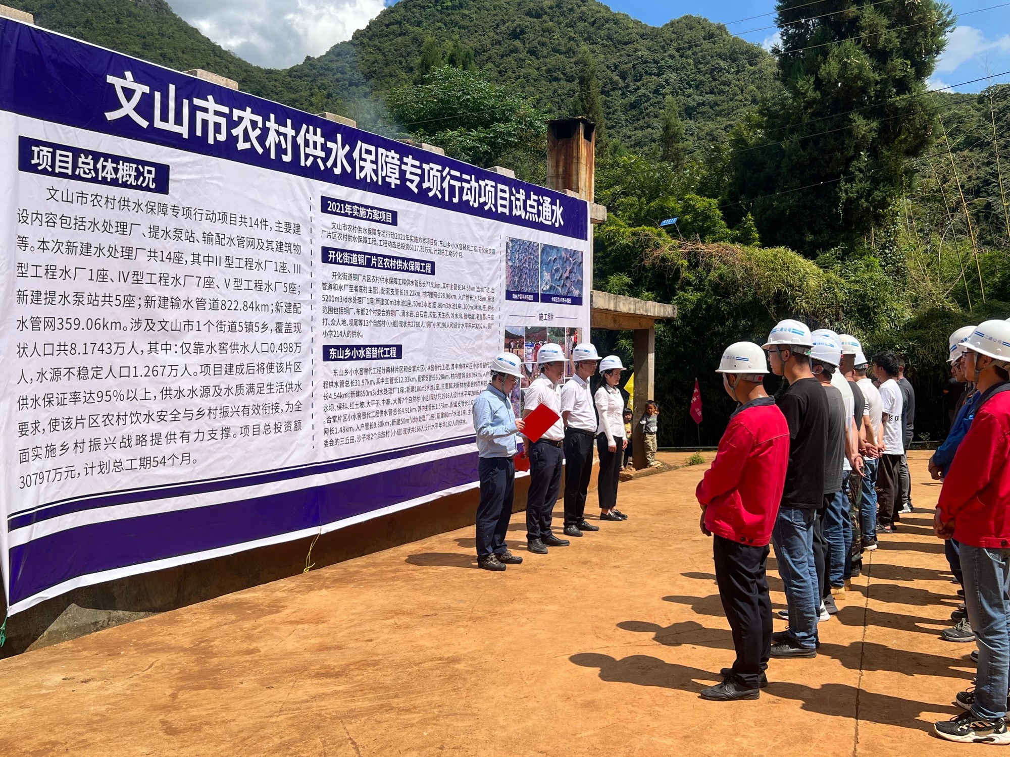 8月23日下午,第九直管部承建的文山市農(nóng)村供水保障專項行動項目首通水儀式在東山鄉(xiāng)南林村委會秀水壩舉行,文山市人民政府副市長、市水務(wù)局、東山鄉(xiāng)政府、項目公司領(lǐng)導(dǎo)及各項目參建單位代表、當(dāng)?shù)厝罕姽餐瑓⒓恿送ㄋ畠x式。