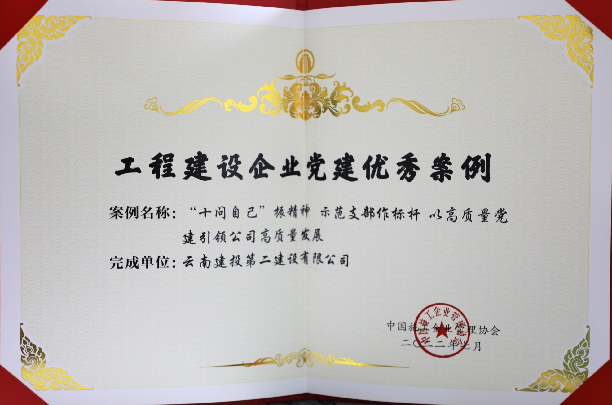 近日,中國施工企業(yè)管理協(xié)會組織開展了工程建設(shè)企業(yè)黨建工作案例申報,公司黨建工作案例《“十問自己”振精神 示范支部作標(biāo)桿 以高質(zhì)量黨建引領(lǐng)公司高質(zhì)量發(fā)展》榮獲工程建設(shè)企業(yè)黨建工作優(yōu)秀案例。