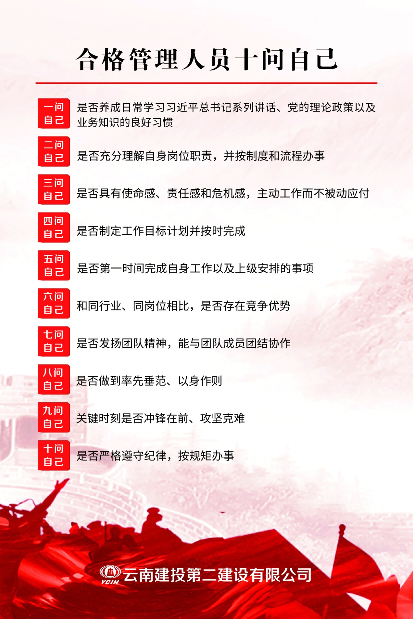 合格管理人員“十問自己”內(nèi)容包含:一問自己是否養(yǎng)成日常學(xué)習(xí)習(xí)近平總書記系列講話、 黨的理論政策以及業(yè)務(wù)知識的良好習(xí)慣。二問自己是否充分理解自身崗位職責(zé),并按制度和流程辦事。三問自己是否具有使命感、責(zé)任感和危機感,主動工作而不被動應(yīng)付。四問自己是否制定工作目標(biāo)計劃并按時完成。五問自己是否第一時間完成自身工作以及上級安排的事項。六問自己和同行業(yè)、同崗位相比,是否存在競爭優(yōu)勢。七問自己是否發(fā)揚團隊精神,能與團隊成員團結(jié)協(xié)作。八問自己是否做到率先垂范、以身作則。九問自己關(guān)鍵時刻是否沖鋒在前、攻堅克難。十問自己是否嚴(yán)格遵守紀(jì)律,按規(guī)矩辦事。