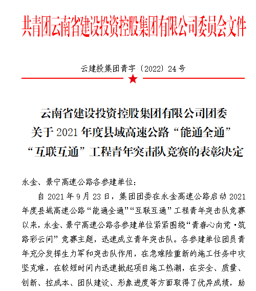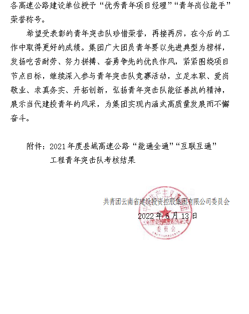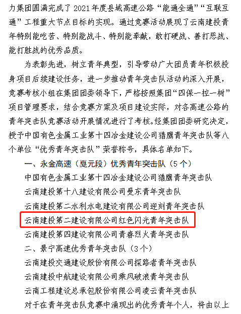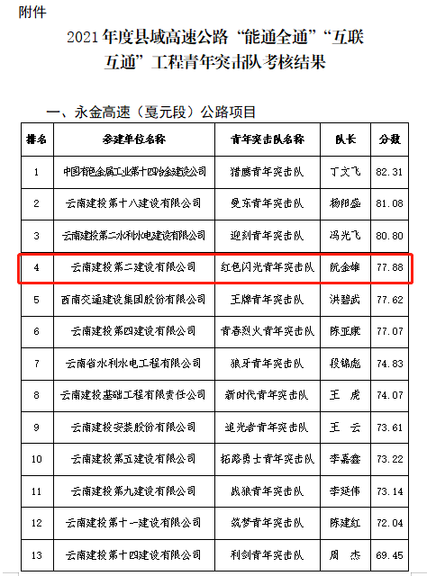 6月13日,集團(tuán)團(tuán)委下發(fā)了《關(guān)于2021年度縣域高速公路“能通全通”“互聯(lián)互通”工程青年突擊隊(duì)競賽的表彰決定》公司第十九直管部永金高速紅色閃光青年突擊隊(duì)赫然在列,在本次考核中,紅色閃光青年突擊隊(duì)以考核第四名的成績獲評集團(tuán)團(tuán)委永金高速優(yōu)秀青年突擊隊(duì)。