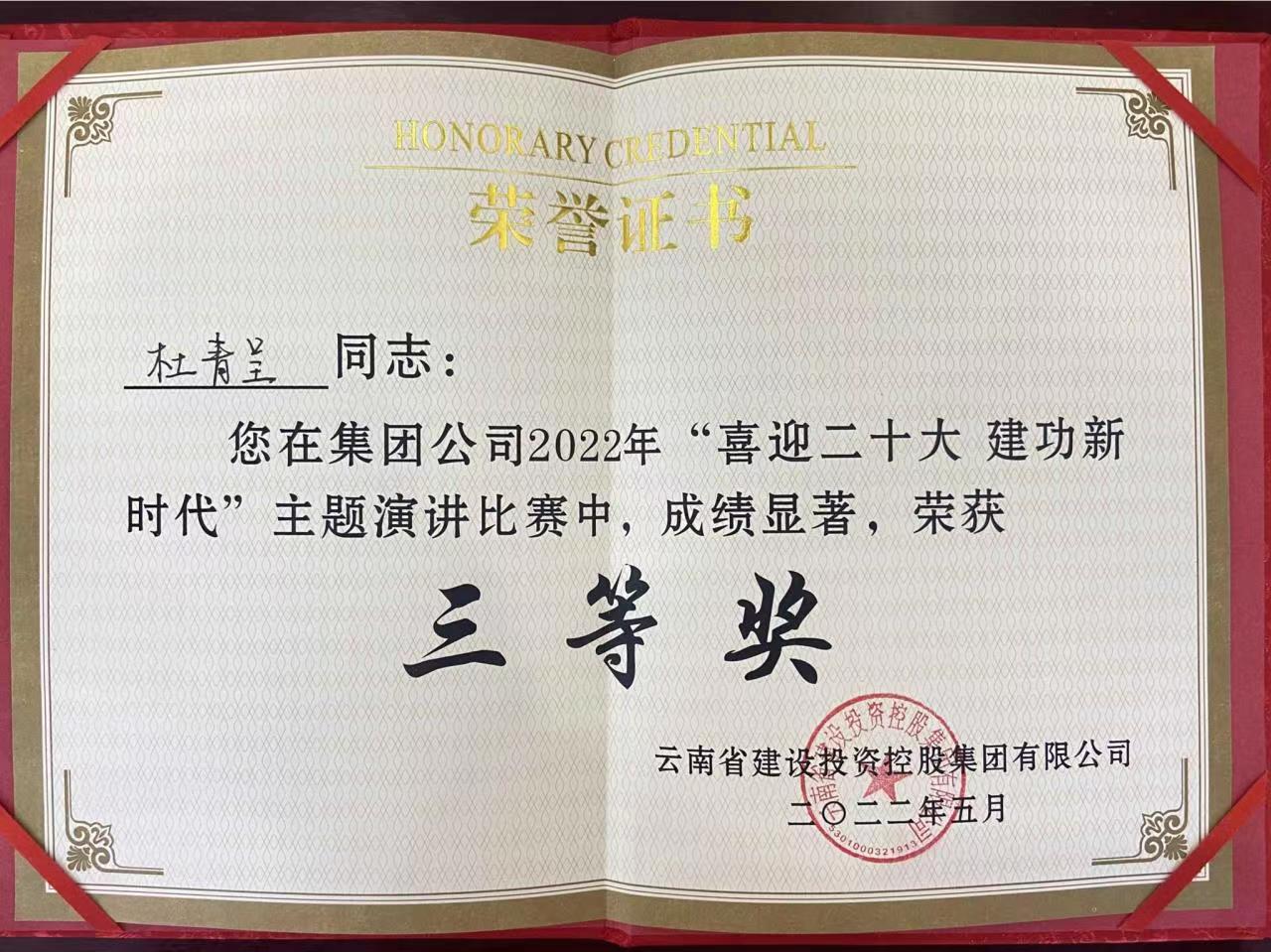 據(jù)悉,本次演講比賽由云南建投集團(tuán)工會(huì)主辦,分復(fù)賽和決賽兩個(gè)環(huán)節(jié),經(jīng)過(guò)集團(tuán)56家單位選送的56名選手激烈的角逐,杜青呈以復(fù)賽排名第15的成績(jī)進(jìn)入決賽,于今日在15位決賽選手中展開(kāi)角逐,最終榮獲三等獎(jiǎng)。