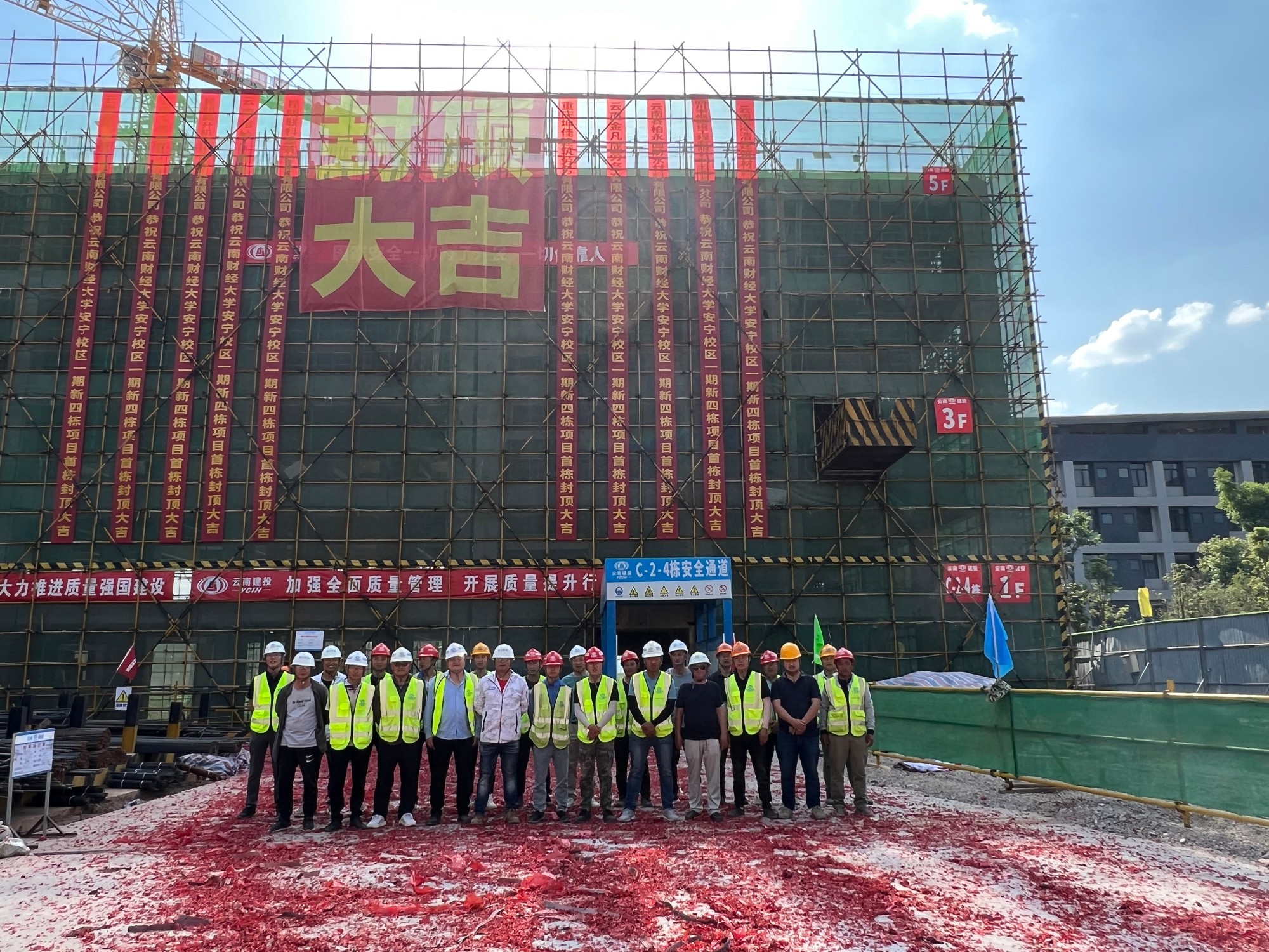 4月29日,伴隨著最后一方混凝土澆筑完成,項目施工現(xiàn)場響起一連串歡快的鞭炮聲,由公司第十一直管部承建的云南財經大學安寧校區(qū)“新四棟”項目首棟主體結構封頂。至此,項目取得階段性成果。