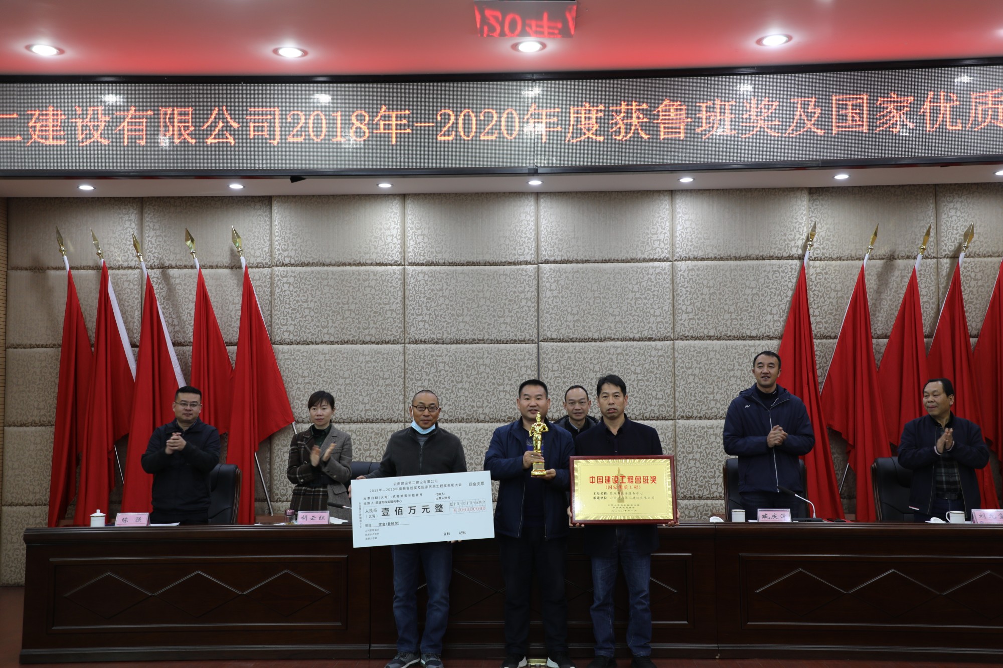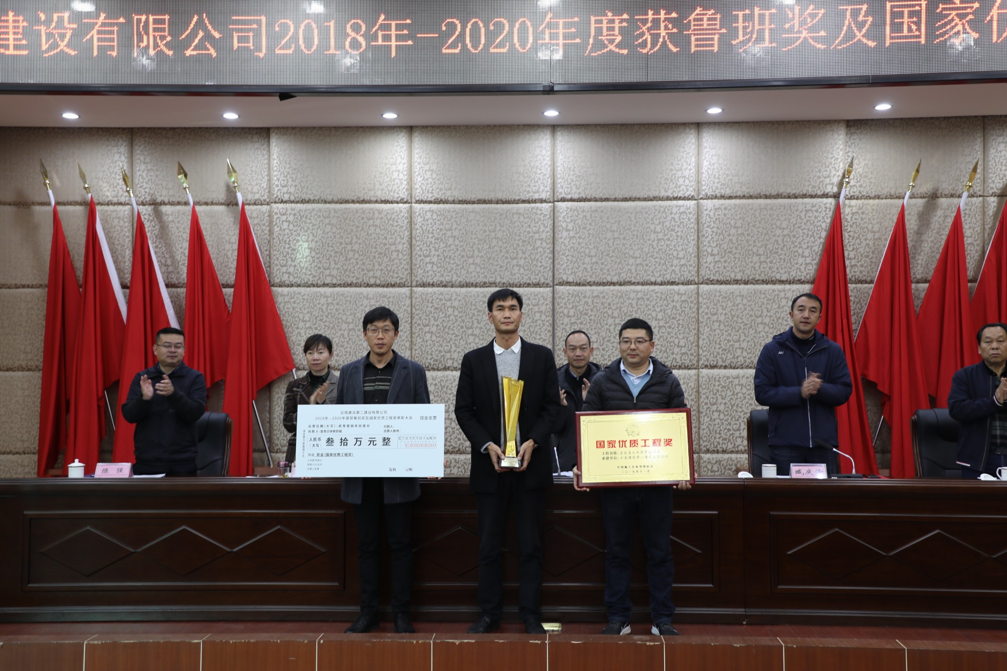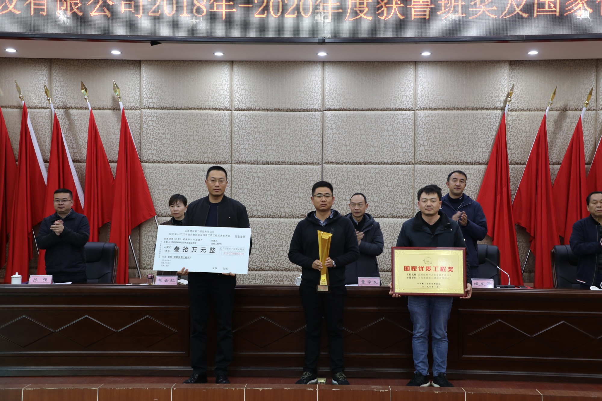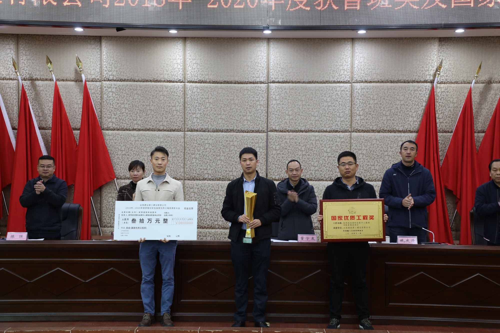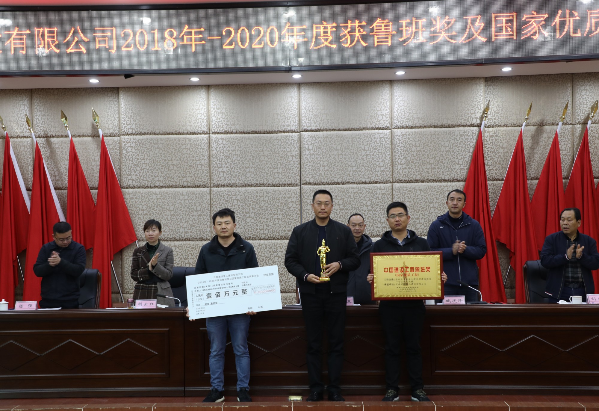董學(xué)友代表公司領(lǐng)導(dǎo)班子對獲獎的單位表示祝賀和感謝,并指出,“十三五”期間,公司在生產(chǎn)、經(jīng)營管理工作保持良好發(fā)展勢頭的同時,質(zhì)量創(chuàng)優(yōu)工作穩(wěn)步推進(jìn)、精心組織、全面策劃,不僅圓滿完成了2018-2020年度制定的質(zhì)量創(chuàng)優(yōu)指標(biāo),質(zhì)量創(chuàng)優(yōu)獎項也再創(chuàng)歷史新高,取得了可喜的成績。公司2018-2020年共獲得魯班獎3項(云南海埂會議中心商務(wù)酒店、滇西應(yīng)用技術(shù)大學(xué)總部建設(shè)項目一號云教育大樓、楚雄市政務(wù)服務(wù)中心)、國家優(yōu)質(zhì)工程獎3項(宜良文體商貿(mào)城、昆明滇池國際會展中心展館及配套商業(yè)項目、昆明院科研實驗大樓建設(shè)項目)。根據(jù)公司《技術(shù)質(zhì)量管理手冊》中《工程項目創(chuàng)優(yōu)獎勵制度》的規(guī)定及公司《關(guān)于2018-2020年度魯班獎、國家優(yōu)質(zhì)工程獎的決定》。公司對獲獎項目,和主要完成單位(第一直管部、第二直管部、第九直管部、第十三直管部、第十五直管部、第一安裝分公司和第二安裝分公司)進(jìn)行表彰,對各獲獎基層單位依照文件規(guī)定頒發(fā)相應(yīng)的獎勵。希望獲獎單位戒驕戒躁,繼續(xù)發(fā)揚工匠精神,為公司創(chuàng)建更多精品工程。