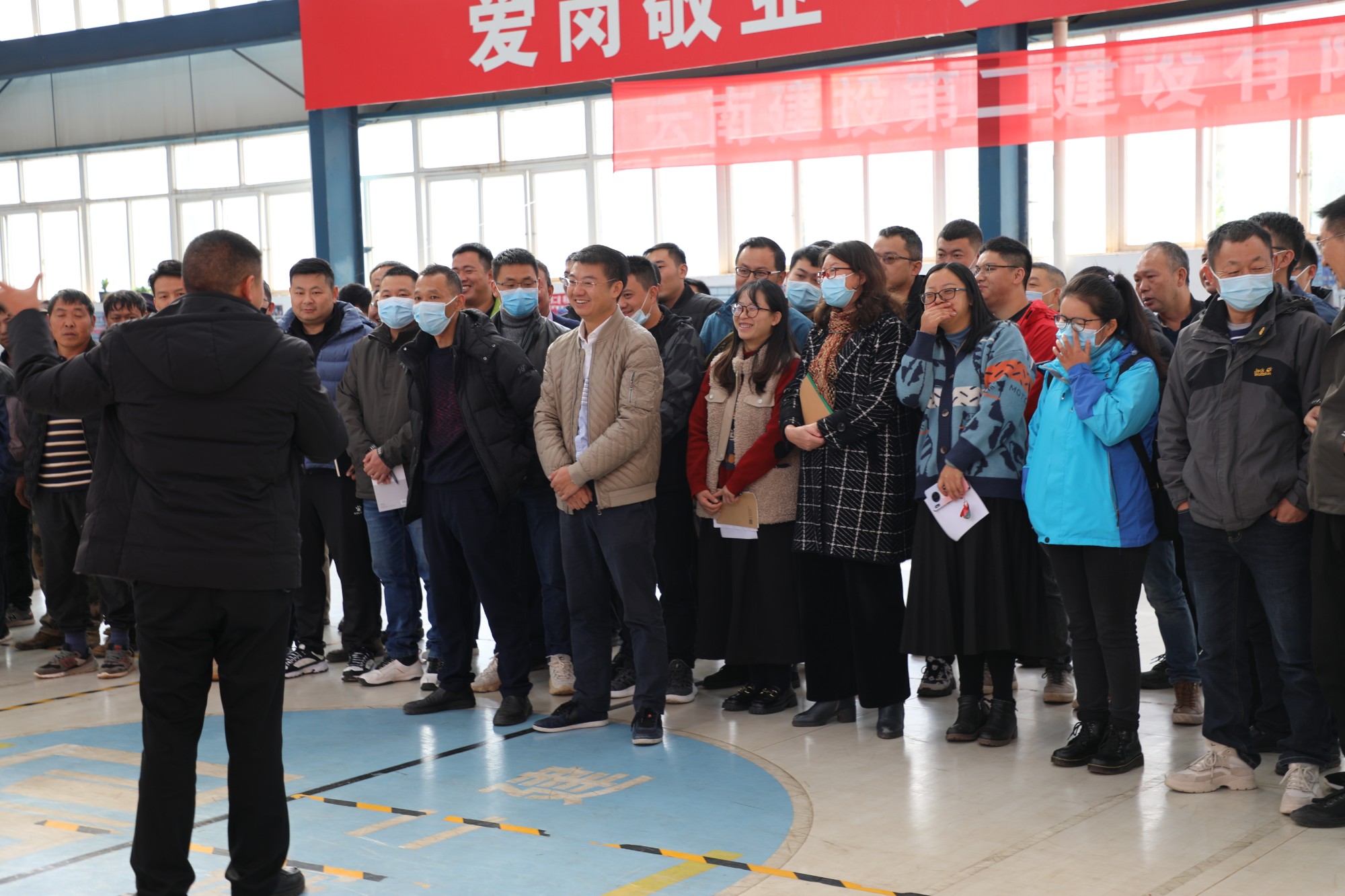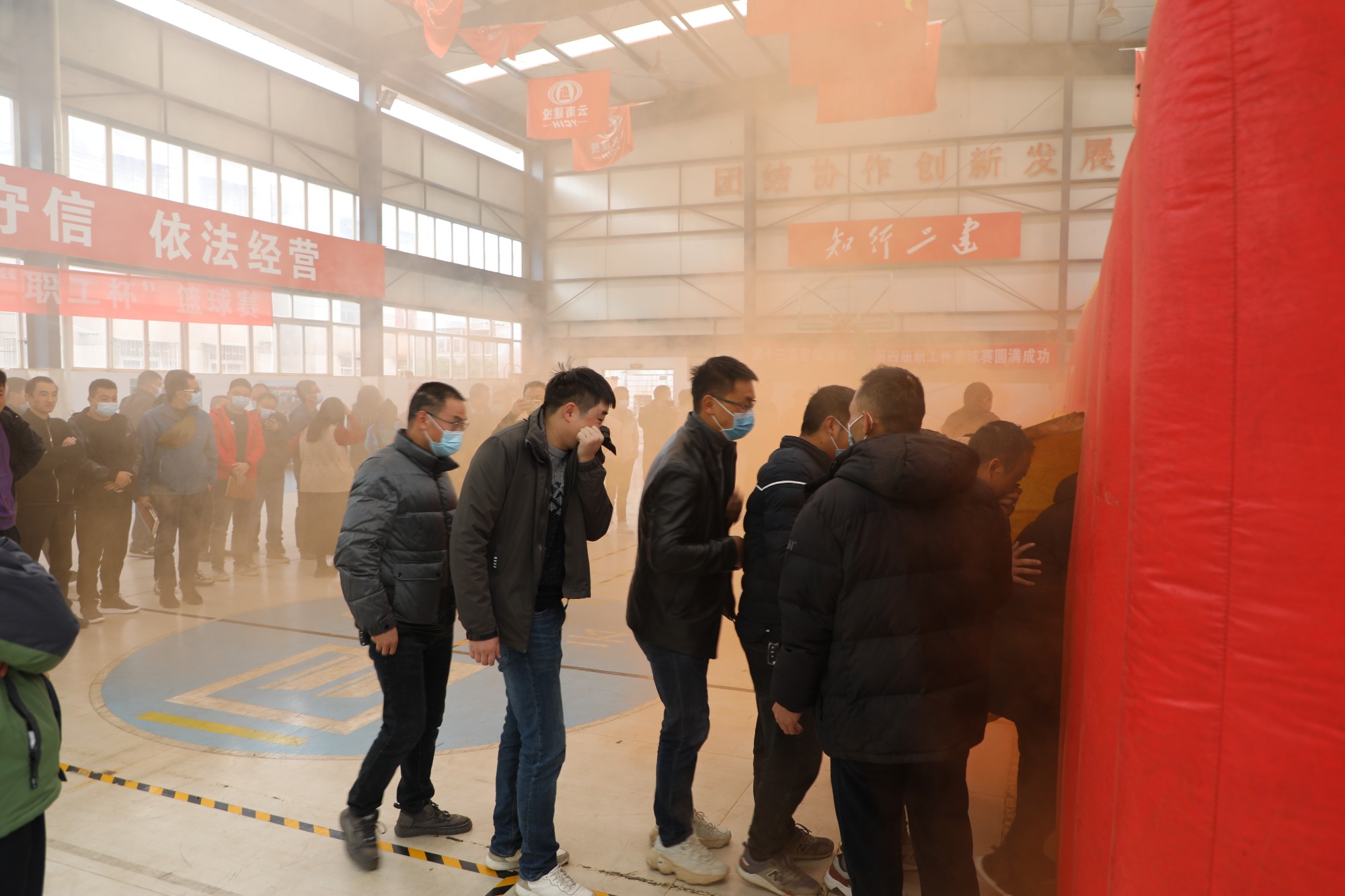 會后,方老師帶領(lǐng)大家來到公司籃球館進(jìn)行火場模擬逃生演練。方老師講解了逃生方法及注意事項后,一顆煙霧彈拉響,模擬火場中濃煙彌漫,萬向遵同大家一起進(jìn)入“火場”,體驗?zāi)M火場逃生的過程。