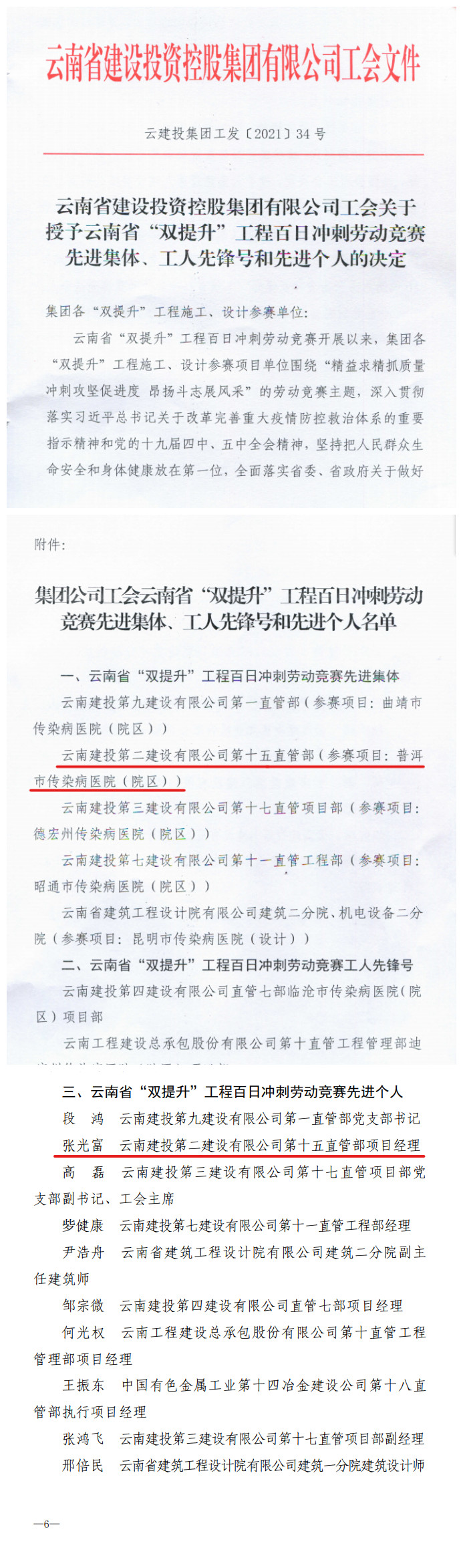 7月5日,集團(tuán)公司工會(huì)印發(fā)《云南省建設(shè)投資控股集團(tuán)有限公司工會(huì)關(guān)于授予云南省“雙提升”工程百日沖刺勞動(dòng)競(jìng)賽先進(jìn)集體、工人先鋒號(hào)和先進(jìn)個(gè)人的決定》,對(duì)在云南省“雙提升”工程百日沖刺勞動(dòng)競(jìng)賽中,作出突出貢獻(xiàn)的集體和個(gè)人進(jìn)行表彰。公司第十五直管部普洱傳染病醫(yī)院(院區(qū))項(xiàng)目喜獲云南省“雙提升”工程“先進(jìn)集體”稱號(hào),項(xiàng)目經(jīng)理張光富喜獲“先進(jìn)個(gè)人”稱號(hào)。