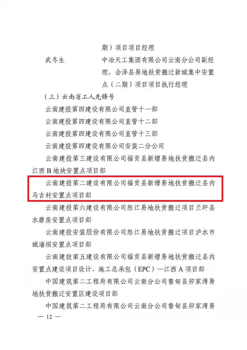 云南省總工會近日對全省易地扶貧搬遷安置工作中作出突出貢獻的單位和個人進行了表彰,公司第一直管部承建的福貢縣新增易地扶貧搬遷縣內(nèi)馬吉村安置點項目部在建期間開展勞動競賽,成績突出,獲得“云南省工人先鋒號”稱號。