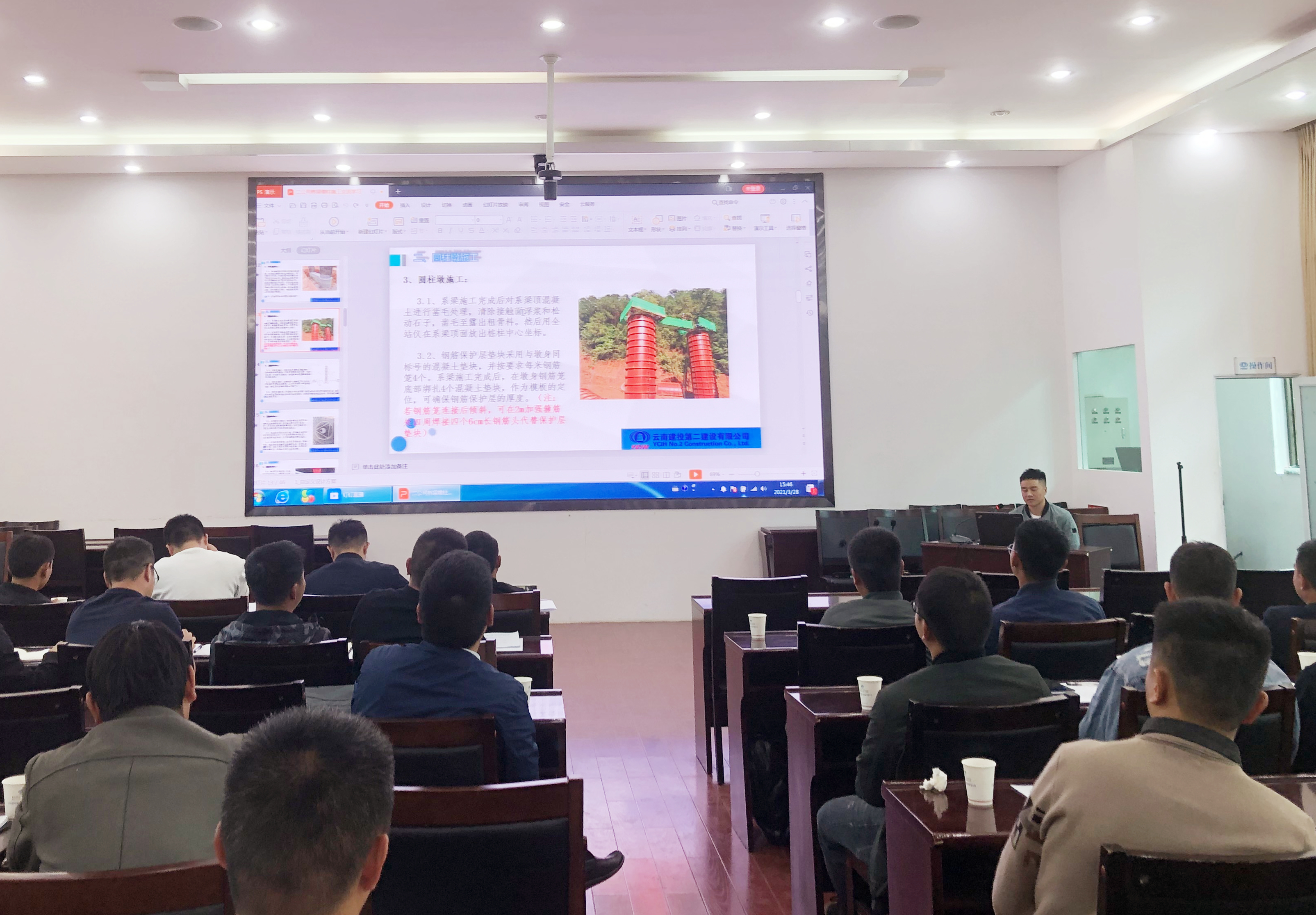3月28日,公司在一樓會議室舉行公路工程隧道及橋梁墩柱施工技術(shù)培訓。公司總工程師付雋蒼出席培訓,第四直管部、第六直管部、第七直管部、第十九直管部及路橋分公司主任工程師、技術(shù)員、施工員等共計40余人現(xiàn)場參訓,同時通過釘釘直播為不能到場人員進行線上培訓。本次培訓邀請第四直管部主任工程師及第十九直管部項目技術(shù)負責人進行授課。