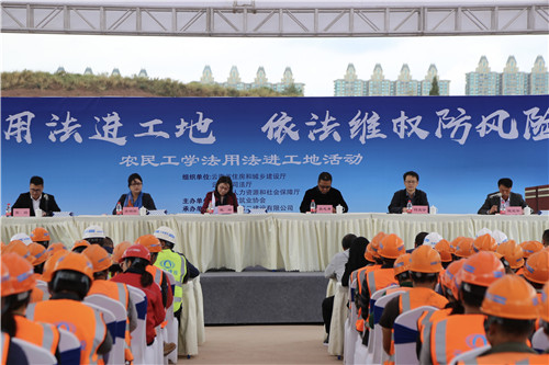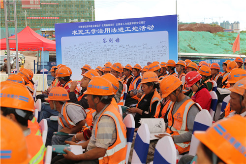 如何保護農民工合法權益、幫助農民工合法維權?農民工作為促進經濟社會發(fā)展的一支重要力量,加強農民工學法用法工作受到了國家的高度重視。11月11日下午,由省住房和城鄉(xiāng)建設廳、省司法廳、省人社廳組織,云南省建筑業(yè)協(xié)會主辦、公司承辦的“學法用法進工地,依法維權防風險”農民工學法用法進工地活動在公司云南財經大學安寧校區(qū)項目舉辦。省住房和城鄉(xiāng)建設廳建筑市場監(jiān)管處處長吳志勇、省人社廳勞動保障監(jiān)察局局長何亞寧、省司法廳《法治與社會》總編輯趙玲、省建筑業(yè)協(xié)會會長吳明燕、公司董事長陳定華出席活動。
