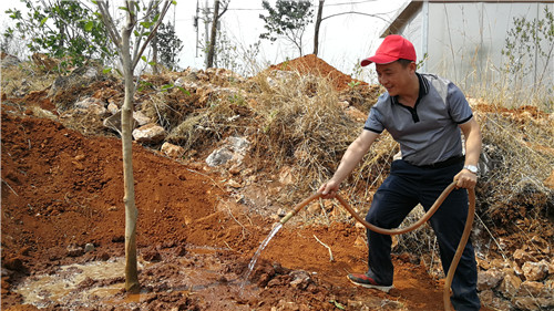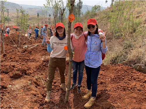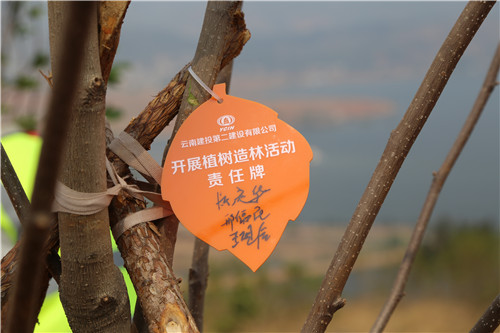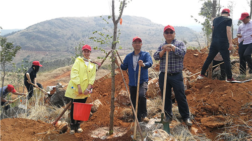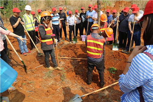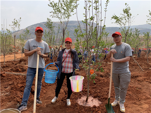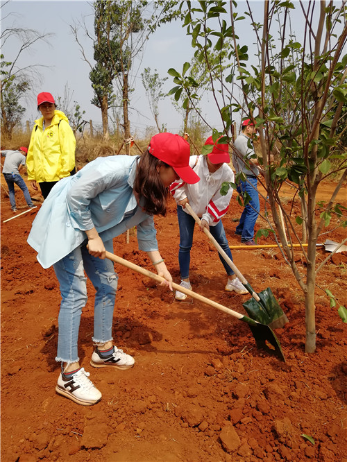 在專業(yè)綠化師傅示范植樹的方法和步驟后。大家在公司工會(huì)主席胡云紅的組織下,迅速分為三人一隊(duì),領(lǐng)取鐵鍬、鋤頭、水桶等工具,各自尋找目標(biāo),在高差十來米的坡上、坡下兩個(gè)種植點(diǎn),大家分工協(xié)作,填土、撐桿、澆水,用了一個(gè)多小時(shí)種完了136棵冬櫻花、100棵玉蘭花。并給每棵樹都掛上了簽著自己名字的責(zé)任牌。