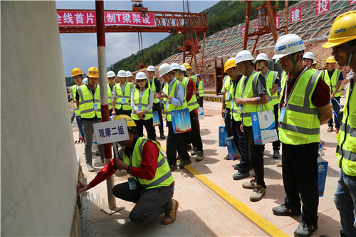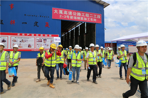 會(huì)后,所有參會(huì)人員分三組參觀大戛高速二工段的鋼筋加工車間、T梁養(yǎng)生系統(tǒng)、鋼筋橫隔板定位支架等工藝。