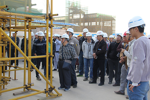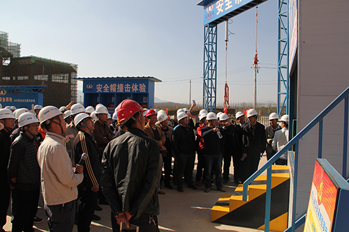 在項目部管理人員的帶領(lǐng)下下,觀摩團先后參觀了樣板展示區(qū)、質(zhì)量安全體驗區(qū)、現(xiàn)場施工工藝等。在質(zhì)量安全體驗區(qū),觀摩團先后參觀了防穿刺體驗、工友之約、移動平臺、傾倒平臺、觸電體驗、洞口墜落體驗等各體驗項目,項目部管理人員一一為大家作了講解和演示。在樣板展示區(qū),觀摩團先后參觀了外架搭建、墻體砌磚、混凝土澆筑、墻體抹灰等各工序的質(zhì)量、技術(shù)標準,大家不時的拿出手機拍照,仔細觀察各施工環(huán)節(jié)的質(zhì)量技術(shù)標準及細節(jié),紛紛表示贊許。
