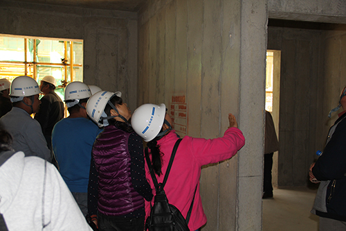 在進入施工現(xiàn)場參觀前,項目部管理人員對觀摩團人員做了安全交底,介紹進入施工現(xiàn)場過程中應(yīng)注意的具體事項。參觀各棟號施工現(xiàn)場中,安全通道里的各種安全宣傳標語和圖解內(nèi)容依次向觀摩團展示了施工現(xiàn)場應(yīng)注意的安全事項和安全操作規(guī)范,樓層內(nèi)部各結(jié)構(gòu)和施工環(huán)節(jié)的工藝展示不時得到了觀摩人員的稱贊,各棟號管理公示牌向觀摩團詳細介紹了樓層的面積、結(jié)構(gòu)、工作內(nèi)容計劃以及具體負責人信心等內(nèi)容,工具化的鋼筋加工棚、工具房、安全防護棚等依次向觀摩團展示了定型化設(shè)備的優(yōu)勢。在項目總承包部,觀摩團來到沙盤展示區(qū),對宜良棚改項目的設(shè)計、整體形象以及各區(qū)域的功能布局進行了參觀。